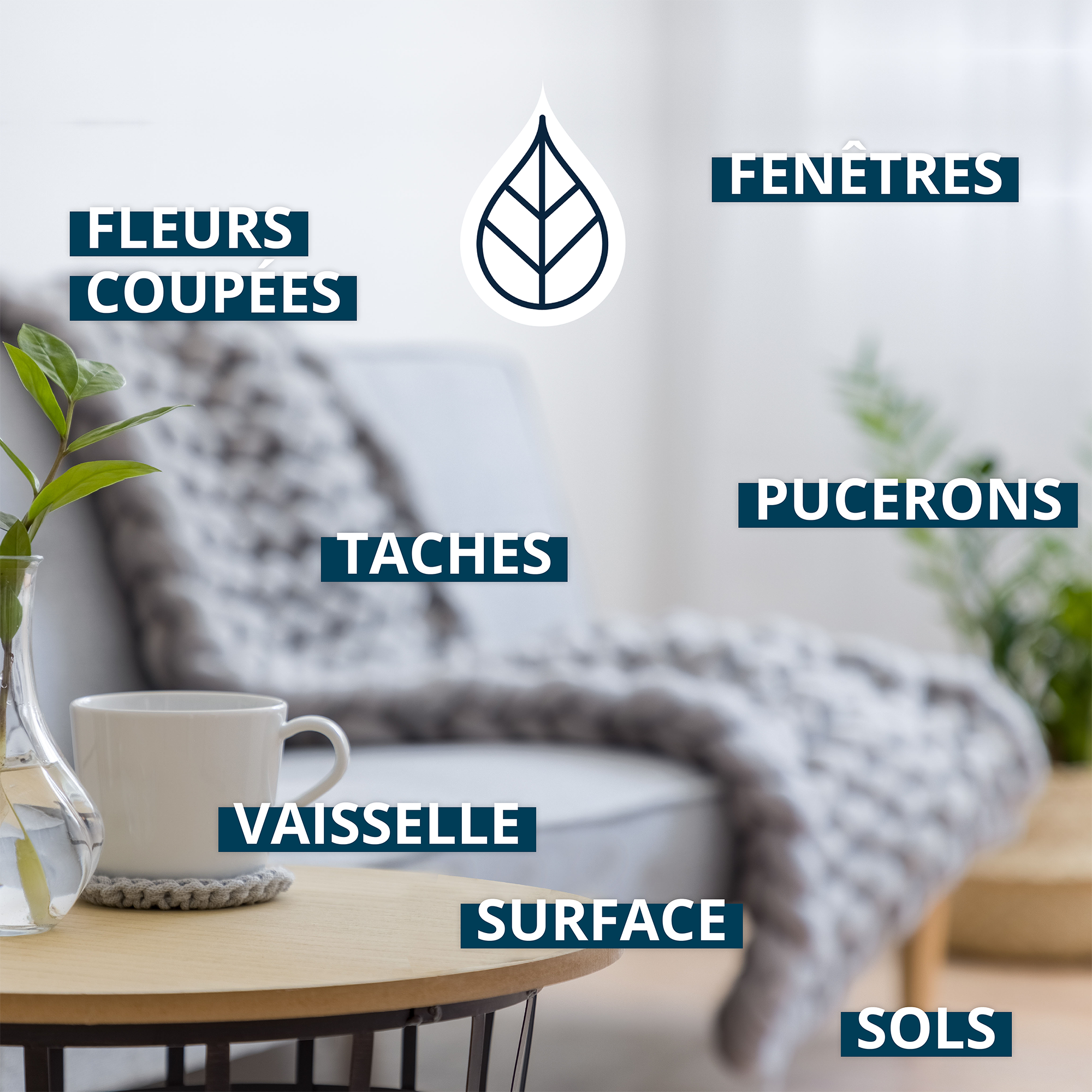 » Pour toutes les surfaces domestiques (soignant et nourrissant) : mettre 2-3 gouttes dans 5 litres d’eau