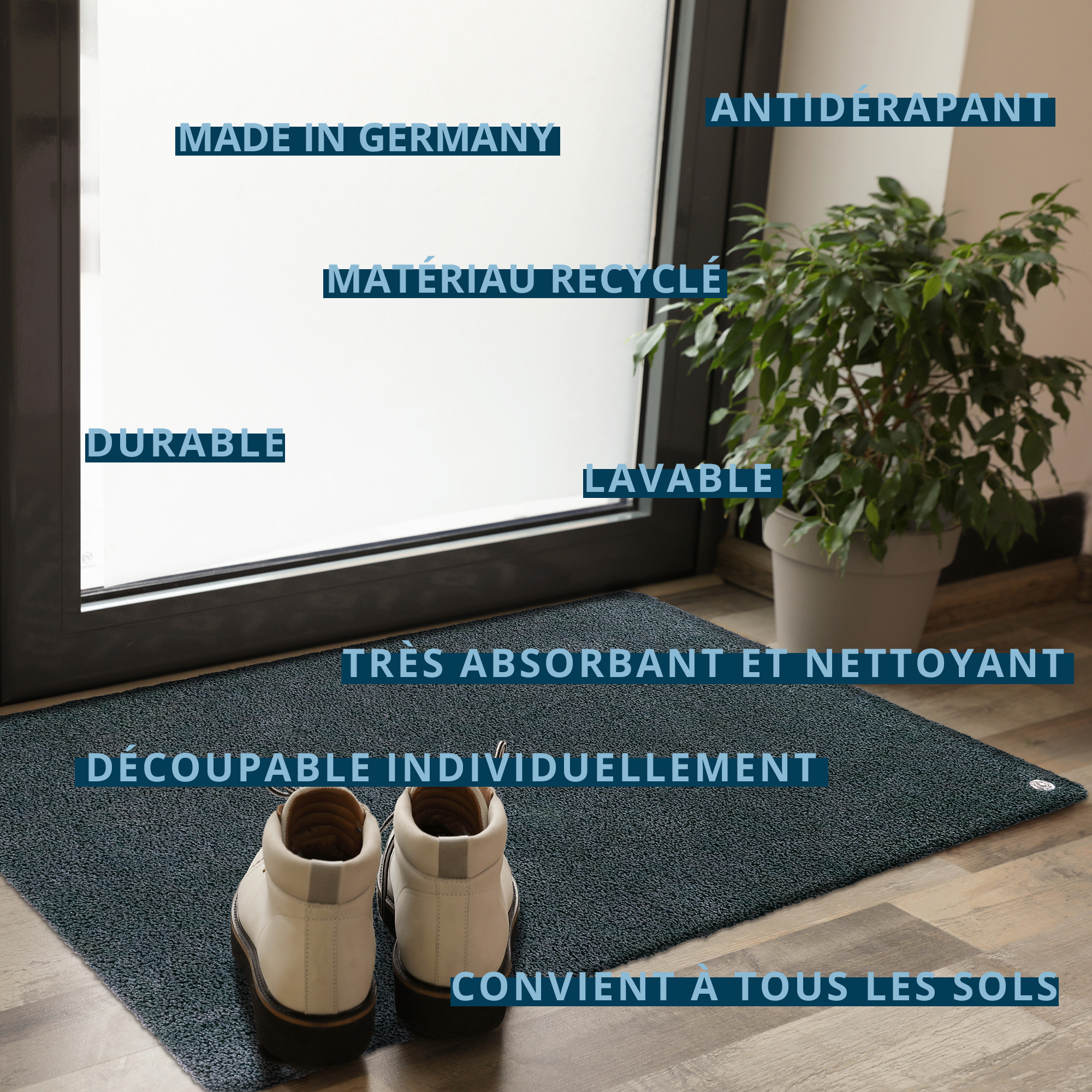 » Antidérapant : le revers souple du paillasson avec sa structure antidérapante allie un poids relativement faible et des propriétés antidérapantes exceptionnelles