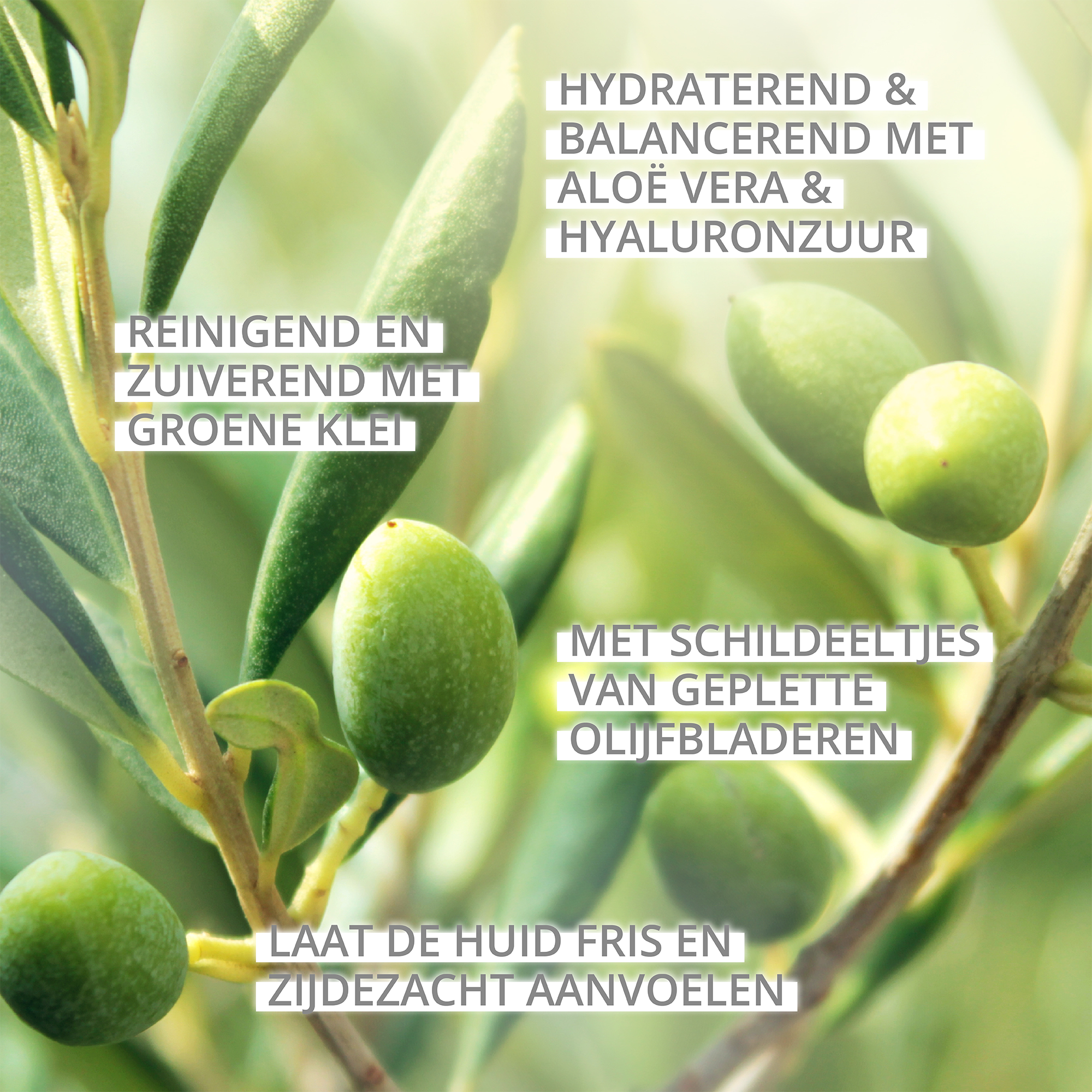 2) Door de geplette olijfblaadjes die erin zitten, kan een licht peelend effect worden bereikt door na het inwerken een zachte massage te geven. Voor een nog gladder gevoel op de huid na het aanbrengen.